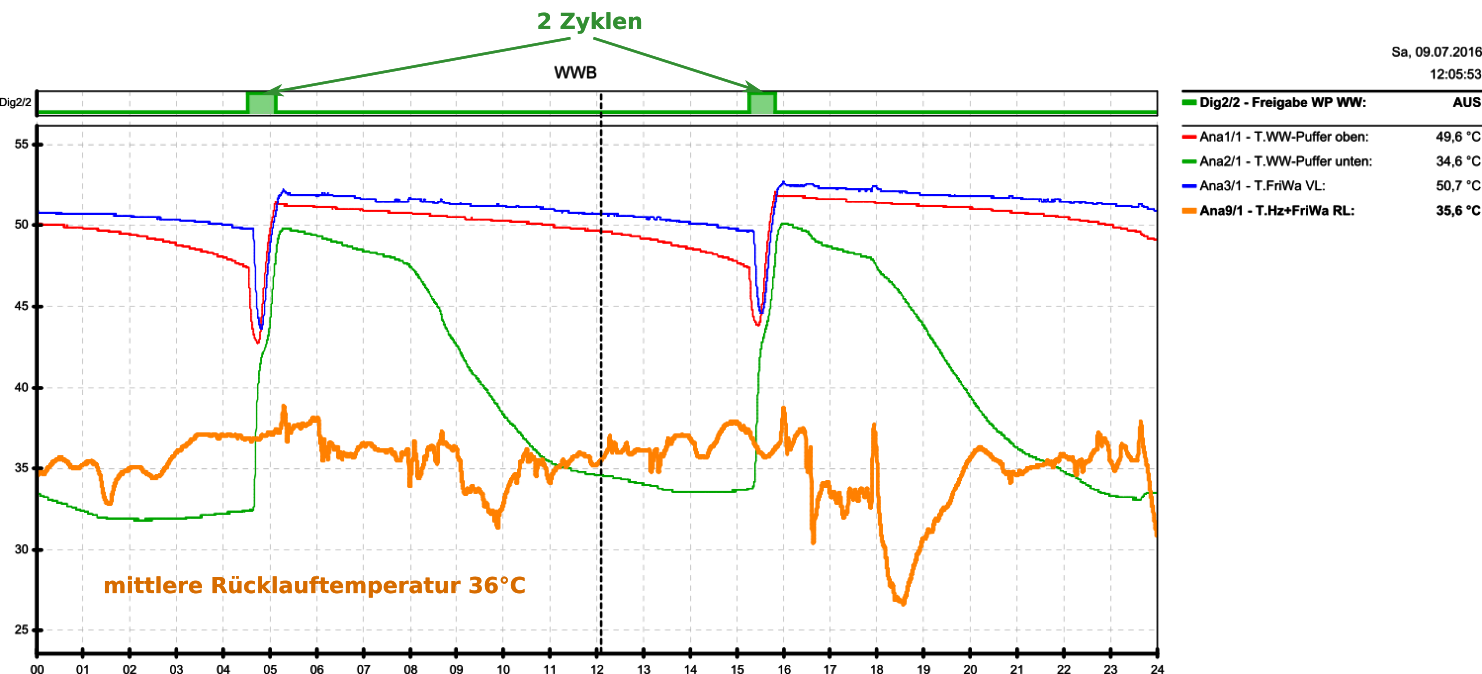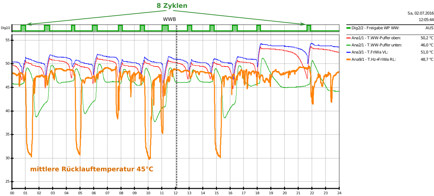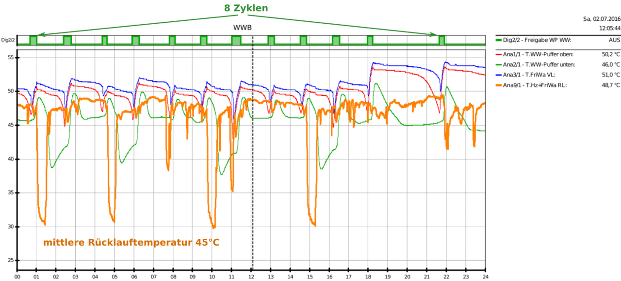 Aufgrund dieser Erkenntnis wurden die Frischwasserstationen kontrolliert und neu eingestellt. Daraufhin sank die Rücklauftemperatur im System, was zu einer sofortigen Verbesserung führte. Die Schaltintervalle der Wärmepumpe konnten von 24 auf 2,5 Zyklen pro Tag gesenkt werden.