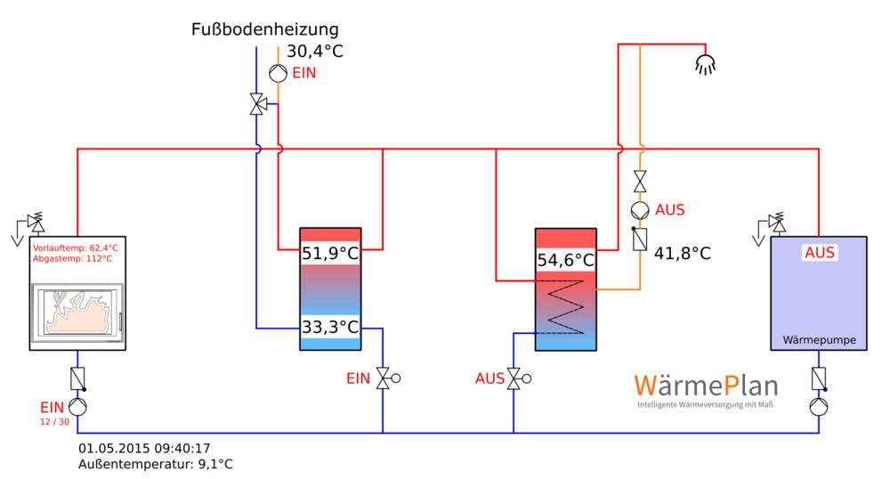 Die Luftwärmepumpe von Buderus / Dimplex mit Warmwasser- und Pufferspeicher wurde so umgestaltet, dass der wasserführende Kamin effektiv in das System integriert werden kann. Die vorhandene Steuerungstechnik wurde in diesem Zuge durch eine zentrale Regelung ersetzt. Sowohl der Energieverbrauch der Wärmepumpe als auch der Hausstrom für den Betrieb der Umwälzpumpen wurden damit nachhaltig gesenkt.