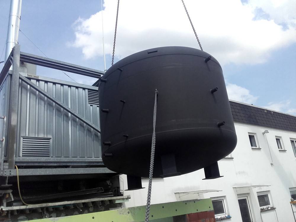 Bäckerei bekommt Pufferspeicher mit dem Kran gesetzt