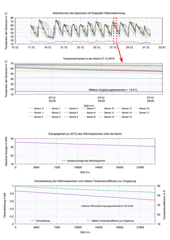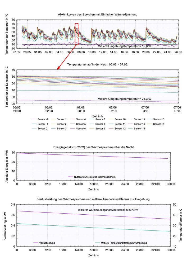 Dazu wurden die Sensoren gleichmäßig über die Höhe des Speichers verteilt. Mit Hilfe der ermittelten Abkühlkurven ließen sich die Wärmeverluste im laufenden Betrieb ermitteln.