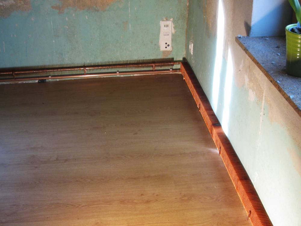 Für einen bisher unbeheizten Raum mit kalten Außenwänden und erhöhter Feuchtigkeit im Mauerwerk wurden Heizleisten installiert. Diese arbeiten wie auch der Holzpelletkessel mit einem hohen Temperaturniveau. Zudem haben sich Heizleisten angeboten, da sie entlang der Außenwand die Wärme in den Raum einbringen, dadurch das Mauerwerk trocknen und die Wandtemperatur erhöhen. Gerade für Gebäude mit schwerer Bauweise wie Stadt- und Bauernhäuser und historische Bauten bietet die Heizleiste eine ideale Möglichkeit zur Raumheizung und der schonenden Trocknung von feuchtem Mauerwerk.
