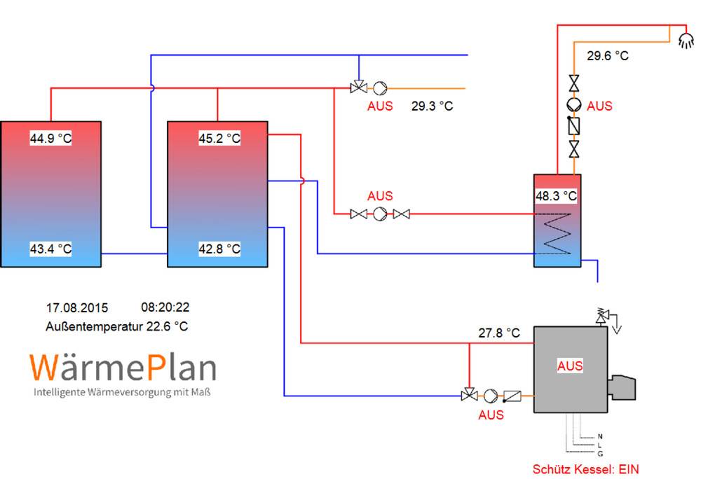 Die Bestandsanlage, bestehend aus einem NMT-Pelletkessel SPK-P, zwei Pufferspeichern und einem Warmwasserspeicher, wurde durch eine Vielzahl unterschiedlicher Regel- und Steuergeräte weitestgehend automatisiert.